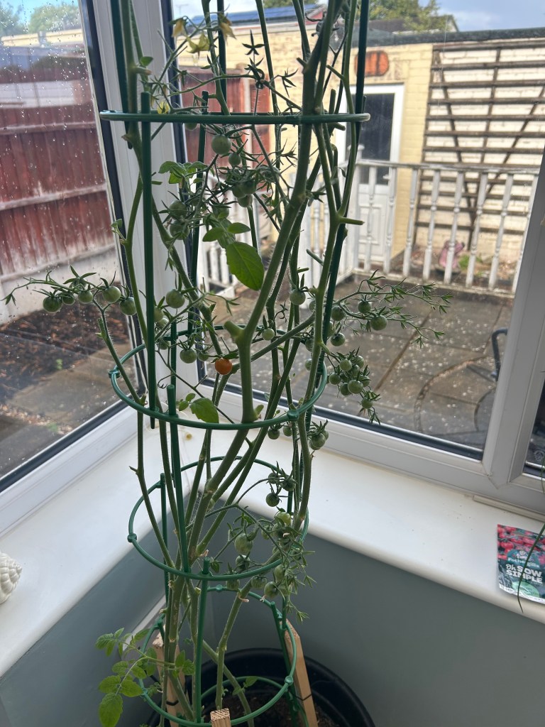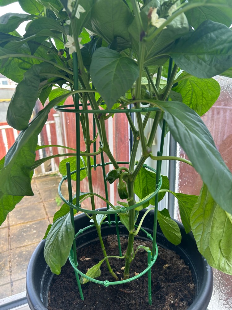 The tomatoes, though, were a real challenge. They shot up so quickly that it felt like every time I checked, they had stretched another few inches. With that rapid growth came problems — stems folding, branches snapping, and even one plant where the main stem broke under its own weight. I soon learned that supports were essential, and I started with easy-to-build, plastic supports to keep them upright.