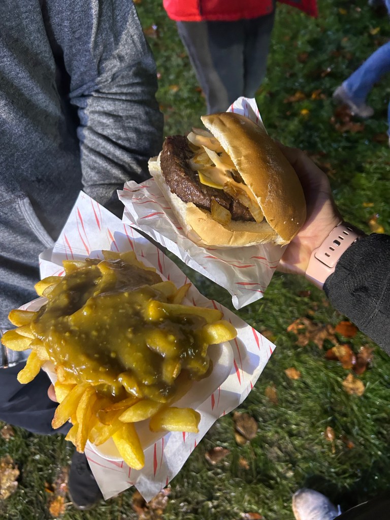 The atmosphere was buzzing — the air filled with the smells of street food, the sounds of live music, and the excitement from the funfair. We wandered around, took it all in, and grabbed a few drinks before sharing a delicious steak burger topped with cheese and sautéed onions, plus a portion of curry chips on the side.
