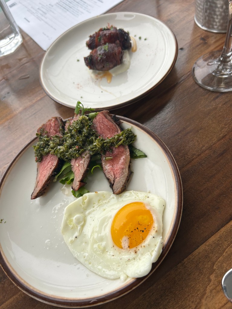 We started with fresh bread and the jam of the day — orange marmalade — alongside a cheese board, fresh fruit, and crab deviled eggs. From there, the plates kept coming: bacon-wrapped dates and tender flank steak topped with a chimichurri sauce and a sunny-side-up egg.