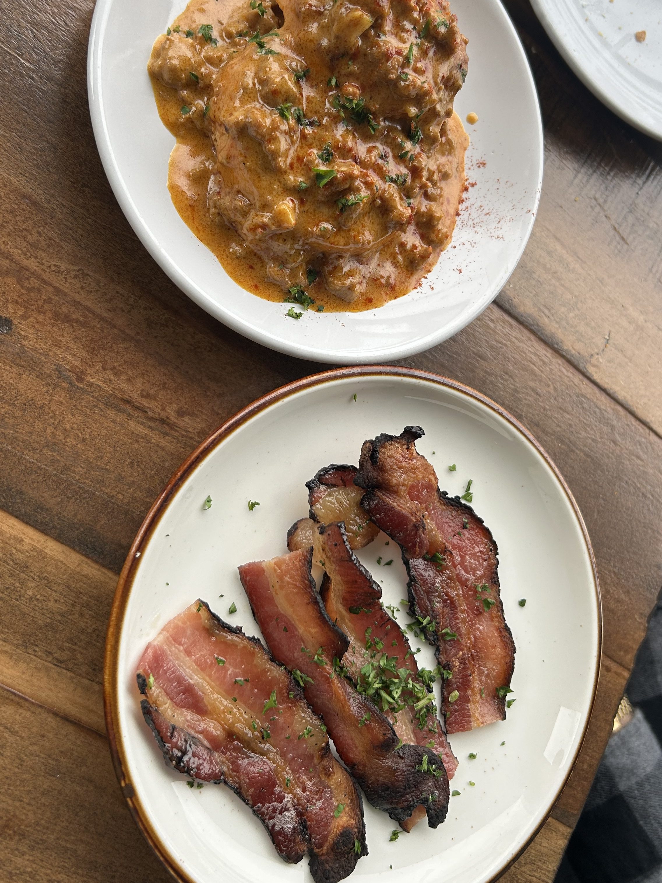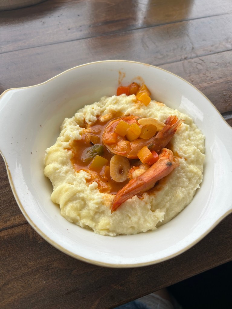 Next up were grilled chorizo, smoked Black Forest bacon, and classic biscuits and gravy, followed by crispy fried potatoes served with tomato sauce and creamy garlic aioli, Spanish croquettes, and rich goat cheese polenta topped with shrimp and seafood gravy. The chorizo and cheese hash brown tots were so good we ordered a second round — and somehow never got a picture (😂).