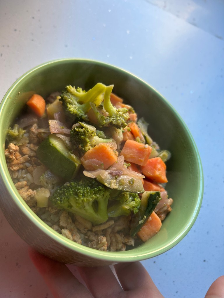For lunches, I’m keeping things balanced and practical. This week it’s ground turkey with roasted vegetables and brown rice, and next week I’ll be making a chicken chili — something hearty that reheats well and supports me through busier days.