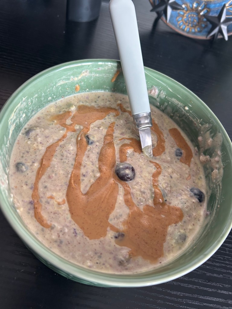 My base included oats, Greek yogurt, chia seeds, flaxseed, cinnamon, turmeric, pinch of black pepper, unsweetened oat milk, and frozen blueberries. Each morning, I warmed it slightly to support digestion and added a spoonful of 100% natural peanut butter.
