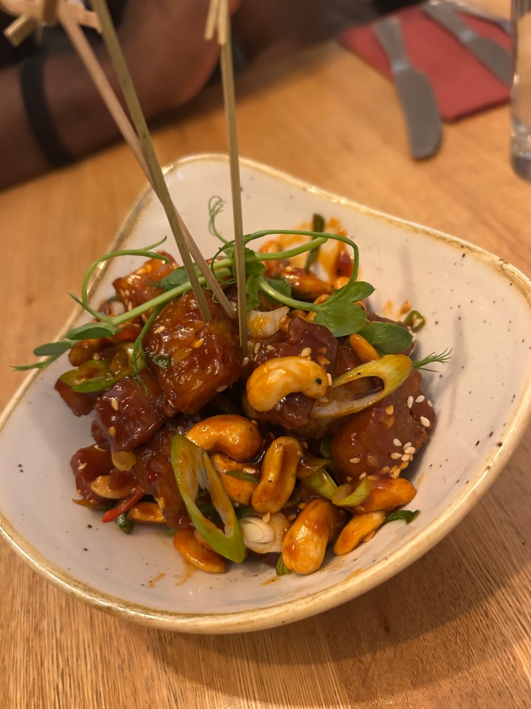 To start, we shared the sticky BBQ pork belly bites with honey-toasted cashews, spring onions, chillies, and sesame seeds — rich, sticky, and packed with flavor.