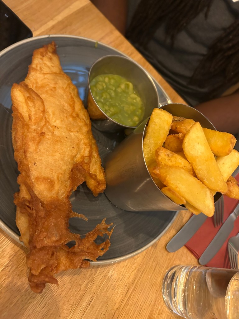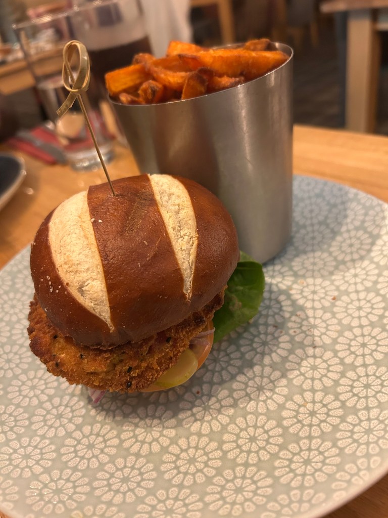 For my main, I chose the Bangkok Bad Boi burger: a chickpea burger topped with gem lettuce, tomato, pickle, red onion, and spiced avocado, all tucked into a pretzel bun and served with sweet potato fries. My husband opted for the deep-fried haddock fillet with thick-cut chips and mushy peas. Both meals were excellent, and the service matched the quality of the food.