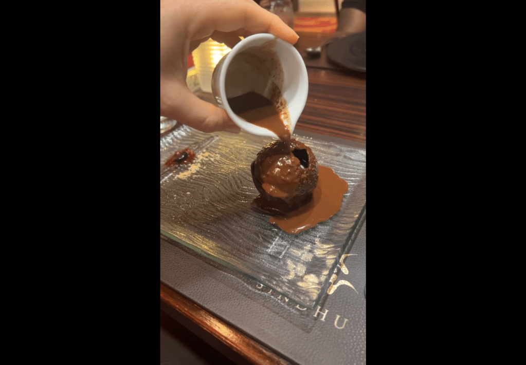 To finish, we shared two desserts — a banoffee apple pie and a dark chocolate sphere filled with white chocolate mousse served with a warm chocolate sauce to pour on top. Both were incredible and the perfect ending to an already fantastic meal.
