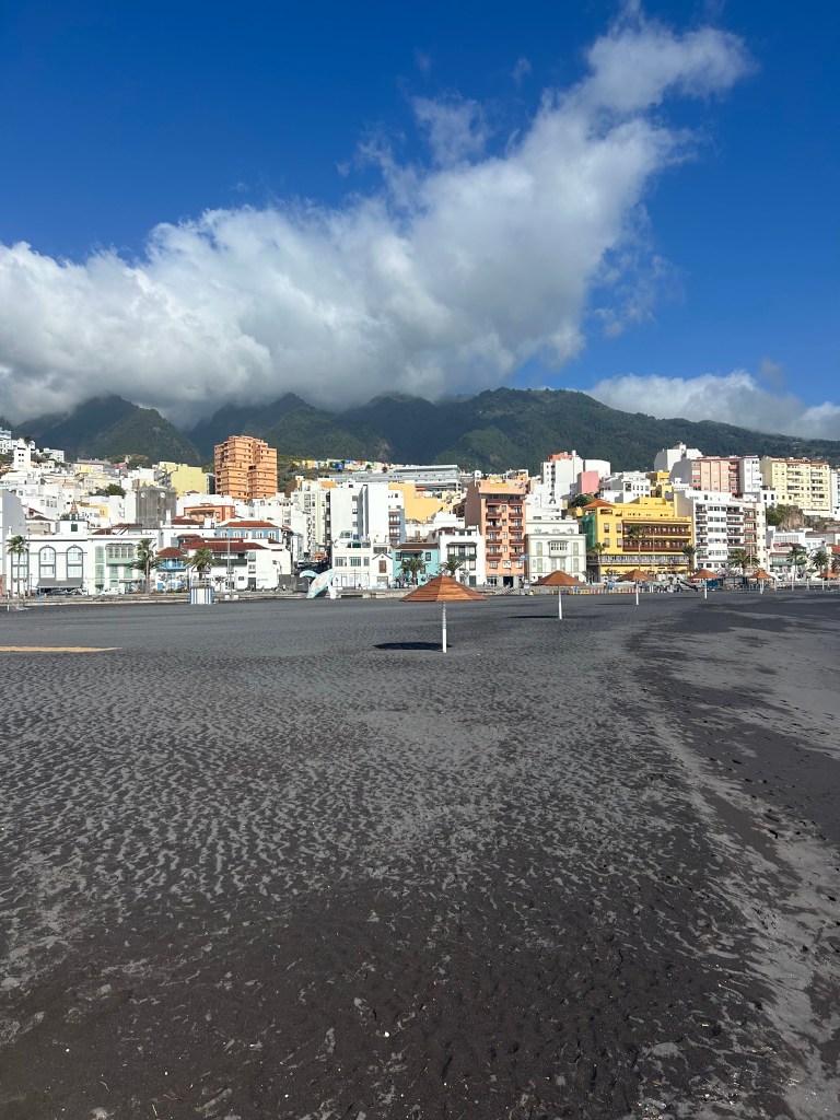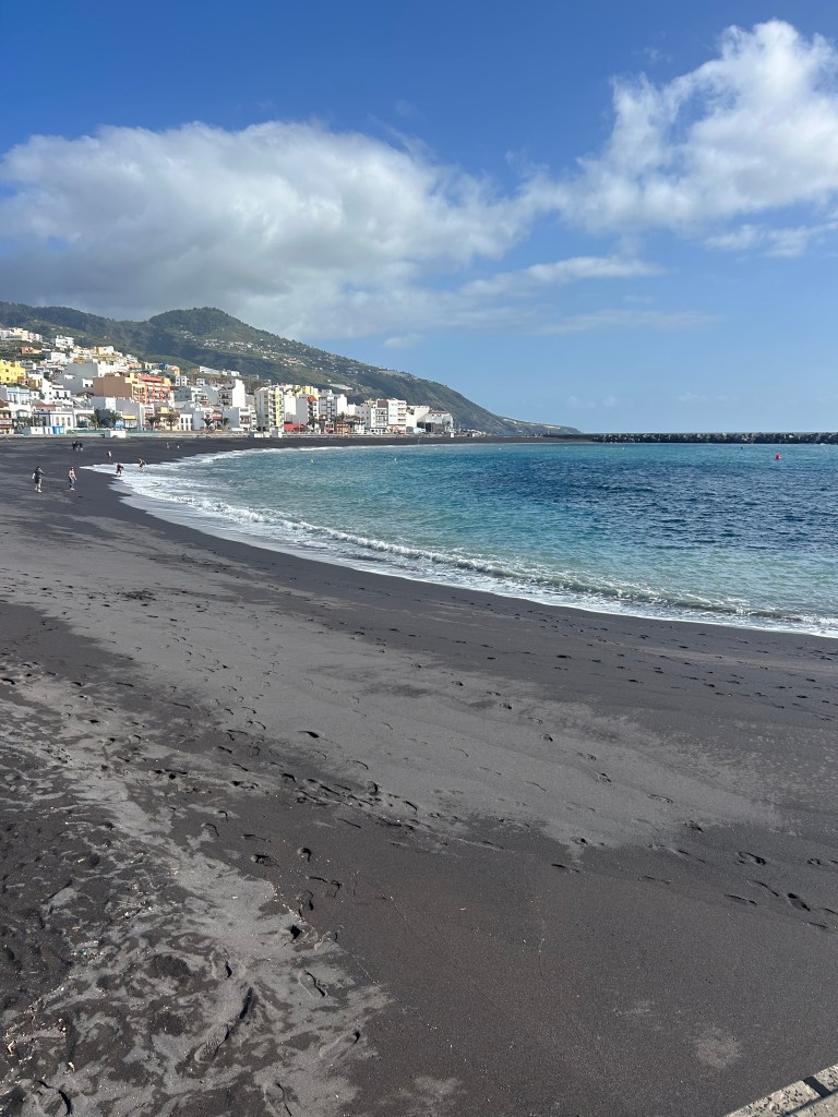 We started our day with a walk into town, making our way first toward the island’s unique black sand beaches. Formed from volcanic rock that has broken down over time, the dark sand is a reminder of the island’s volcanic origins — and it was surprisingly beautiful. The way the sunlight shimmered off the sand, contrasted by the turquoise water, with colorful buildings and mountains in the background, made for such a striking scene.