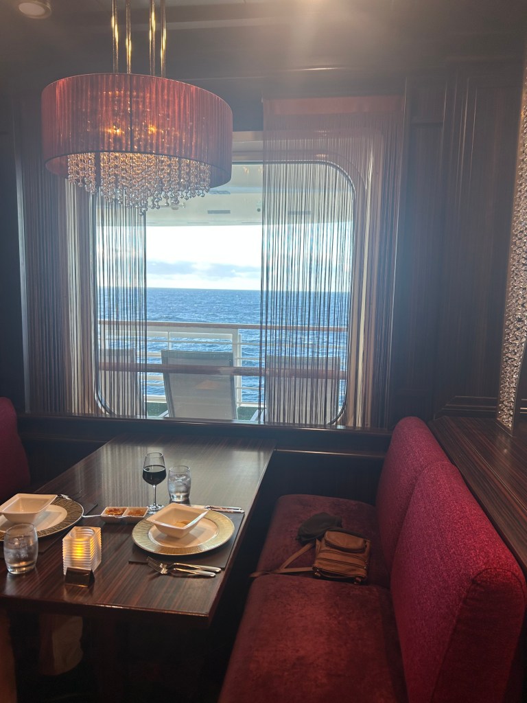 That evening, we had reservations at Sindhu, one of the ship’s specialty restaurants, and it turned out to be another highlight of the trip. We had one of the first seatings of the evening, which meant a quieter atmosphere and a lovely booth by the window overlooking the ocean as we sailed away from La Palma — an ideal setting for dinner.