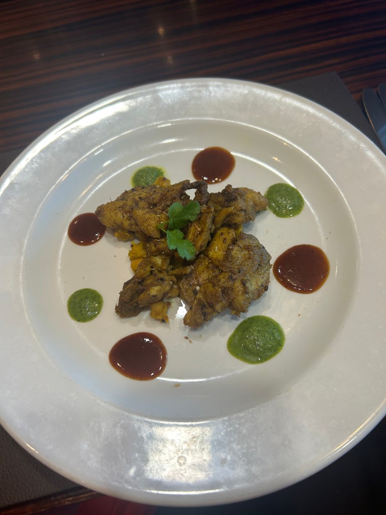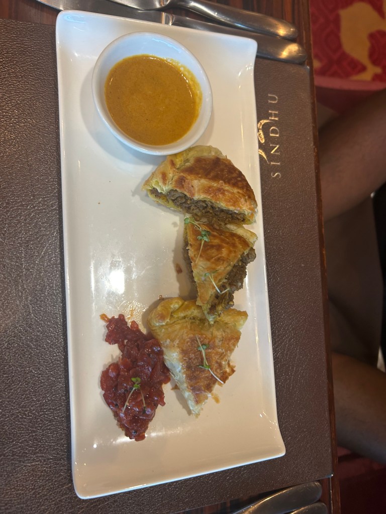 The service was fantastic, and for a very reasonable additional charge, we opted for the three-course menu. To start, I had the Dakshin Murg — tikka grilled chicken served with coconut and chickpea salad, along with mint and tamarind dips — which was bursting with flavor and left me wanting more. My husband chose the Gosht Murtabak, a spicy ground beef flatbread with onion relish and curry sauce, and thoroughly enjoyed it.