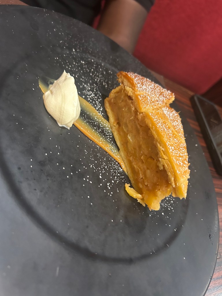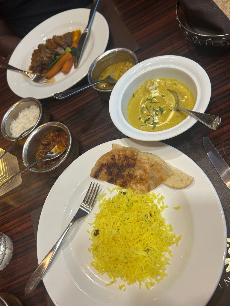 For our main courses, I ordered the Murgh Irani Korma — a beautifully spiced, cardamom-infused chicken korma served with cashew nuts and raisin pilau rice — while my husband had the Akkah Gosht, a roast lamb rump served with keema matar, pak choi, baby carrots, and a rich Rogan jus. Alongside our mains came a selection of dal, vegetable thoran, and Indian breads, which completed the meal perfectly. Everything was absolutely delicious, and the entire experience felt special from start to finish.