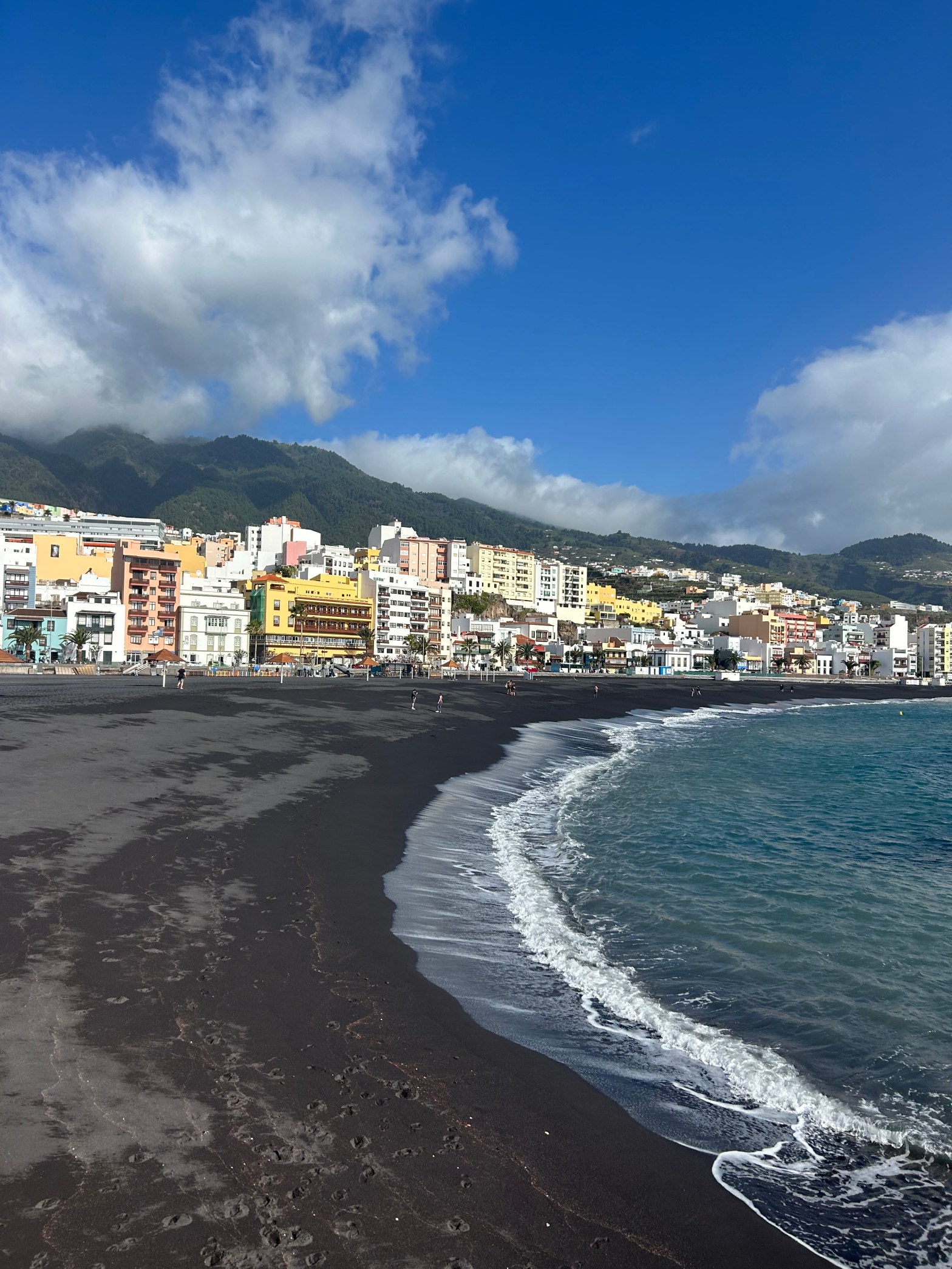 We started our day with a walk into town, making our way first toward the island’s unique black sand beaches. Formed from volcanic rock that has broken down over time, the dark sand is a reminder of the island’s volcanic origins — and it was surprisingly beautiful. The way the sunlight shimmered off the sand, contrasted by the turquoise water, with colorful buildings and mountains in the background, made for such a striking scene.